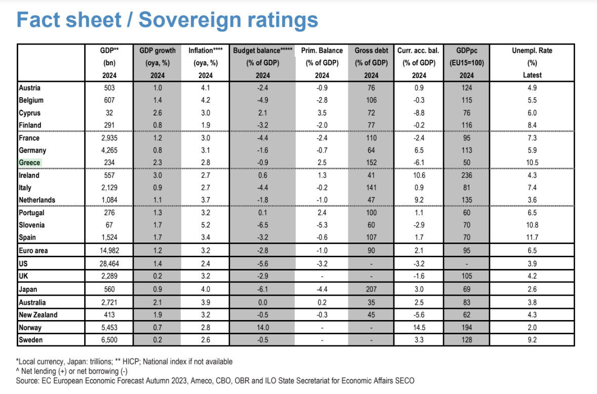 Οι οικονομολόγοι της JP Morgan για φέτος τοποθετούν την ελληνική ανάπτυξη στο 2,3% και τον πληθωρισμό να αναμένεται στο 2,8%, με το ΑΕΠ να ανέρχεται σε 234 δισ. ευρώ. Η χώρα θα σημειώσει έλλειμμα στον προϋπολογισμό της της τάξεως του 0,9%, χαμηλότερα από το όριο του 1%, με το πρωτογενές πλεόνασμα στον προϋπολογισμό να διαμορφώνεται στο 2,5%. Η τράπεζα εκτιμά ότι το ακαθάριστο χρέος ως προς το ΑΕΠ θα μειωθεί περαιτέρω σε 152%, με το αλλά το έλλειμμα στο ισοζύγιο τρεχουσών συναλλαγών να μειώνεται μεν, αλλά να παραμένει σε υψηλά επίπεδα της τάξεως του 6,1%. Τέλος, το κατά κεφαλήν ΑΕΠ για τη χώρα μας ως ποσοστό του κατά κεφαλήν ΑΕΠ της Ευρωζώνης των 15 χωρών θα παραμείνει σε χαμηλά επίπεδα της τάξεως του 50%, με την Πορτογαλία να ακολουθεί με 60% και την Κύπρο με 76%.