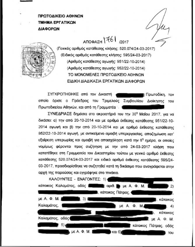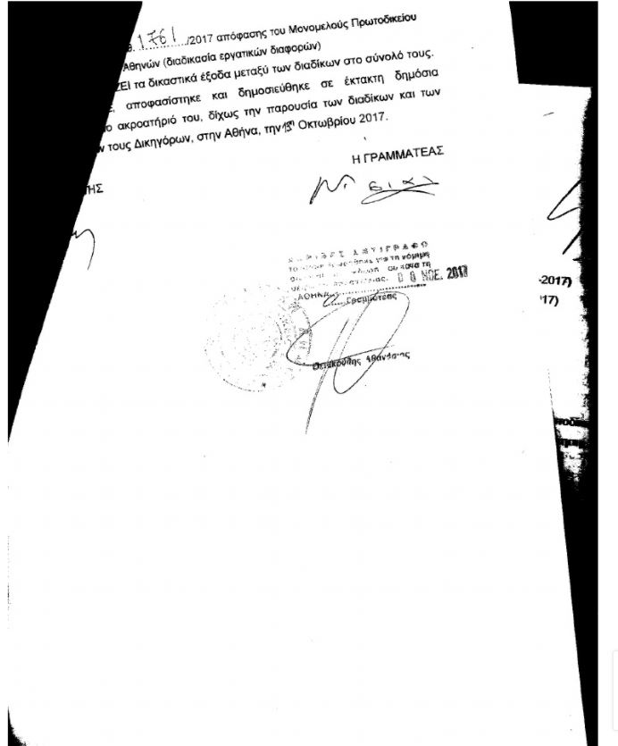 Η υπόθεση εκδικάστηκε στις 30 Μαΐου 2017 στο τμήμα εργατικών διαφορών του Πρωτοδικείου Αθηνών. Στις 8 Νοεμβρίου 2017, οι εργαζόμενοι κέρδισαν τον αγώνα τους. Με την απόφαση 1761/2017, το δικαστήριο τους δικαίωσε, υποχρεώνοντας την εταιρεία να καταβάλει το σύνολο των δεδουλευμένων συν τους τόκους. Αυτό που διεκδικούσαν οι εργαζόμενοι, αλλά δεν τους το αναγνώρισε το δικαστήριο ήταν η αποζημίωση για οδοιπορικά για εκπαιδευτικά ταξίδια στην Αθήνα.